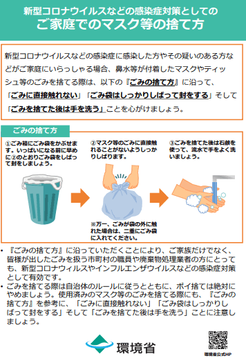 新型コロナウイルスなどの感染症に感染した方やその疑いのある方などがご家庭にいらっしゃる場合、鼻水等が付着したマスクやティッシュ等のごみを捨てる際の注意事項が環境省から示されました。