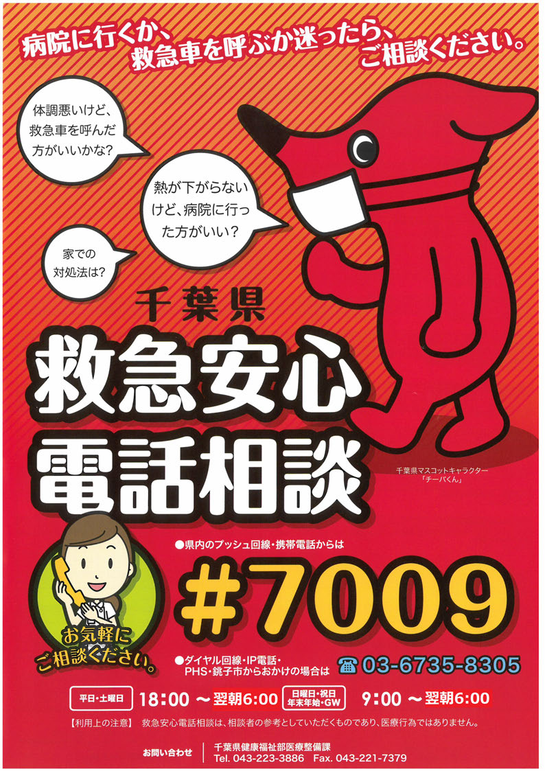 「こども急病電話相談 #8000」、「救急安心電話相談 #7009」を相談窓口としてご利用いただけます。