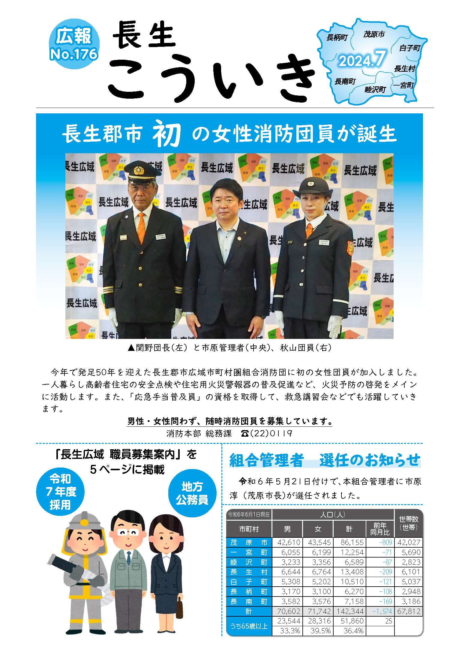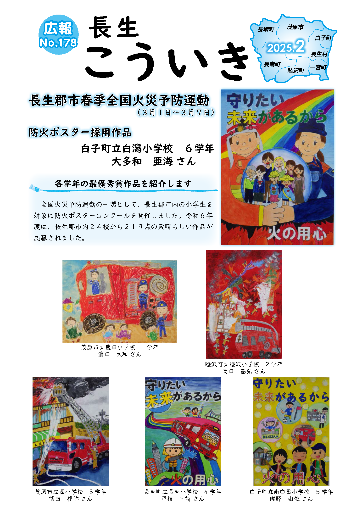 広報「長生こういき」 長生郡市広域市町村圏組合の広報紙「長生こういき」は、年4回、4月・7月・10月・2月の1日発行です。 【配布方法】 1 新聞折込み(発行月1日の朝刊) 折込みする新聞は、朝日新聞・読売新聞・産経新聞・毎日新聞・千葉日報・東京新聞・日本経済新聞です。※令和4年7月発行分から新聞折込みを2日から1日に変更しました。 2 公共施設や店舗への設置配布長生郡市内のスーパーや郵便局、公共施設などに広報紙を設置しています。気軽に広報紙を手に取り、読んでいただけるようになりましたので、ぜひご利用ください。 ※広報紙の部数に限りがあるため、長生郡市内すべてのスーパーなどに広報紙を設置しているわけではありません。また、納品の関係により店舗等への広報紙の設置については、発行日に置かれていない場合がありますので、ご了承ください。 広報「長生こういき」配布場所一覧(pdf:239KB) 【令和7年8月現在】 ※個別郵送の対応は行っていません。※長生郡市内で、設置配布があると便利な店舗や金融機関などのご要望がありましたら、設置配布の依頼を行いますので、事務局総務課 企画財政係(☎0475-23-0107)までご連絡ください。 公立長生病院広報「なのはなNEWS」 公立長生病院広報紙「なのはなNEWS」は、こちらからご覧ください。 広報「長生こういき」発行時にお知らせ(メールマガジン)が届きます メールマガジン購読・解除 広報「長生こういき」発行のお知らせ(無料) 購読 解除 読者購読規約 powered by まぐまぐ! 広報「長生こういき」の最新号が発行されたことをお知らせするメールが届きます。 民間のメールマガジンサービスです。読者購読規約をお読みの上ご利用ください。 購読の登録方法は以下のとおりです。 1.「購読」の左側にチェックが入っているか確認 2.入力欄に受信したいアカウントのメールアドレスを入力 3.「送信」をクリック 購読を止めたい場合は、解除の左側にチェックを入れて同様の操作をしてください。注:無料のメール発行サービスを利用しているため、メールマガジン内に広告が掲載されていますが、ご了承ください。 広報「長生こういき」を『ちいき本棚』に掲載しました ちいき本棚とは このシステム・アプリは、東京インタープレイ株式会社が作成したものです。 システムやアプリの利用方法などについては、東京インタープレイ株式会社へお問い合わせください。 ちいき本棚ホームページ https://sidebooks.jp/chiiki/index.html バナーをクリックすると「長生こういき」の一覧が開きます。 QRコードはこちら 【お詫びと訂正】広報「長生こういき」令和7年2月号の掲載記事に誤りがありました 令和7年度(2025年度) ◇No.181 令和7年10月号 (pdf:2.8MB) ◇No.180 令和7年7月号 (pdf:2.3MB) ◇NO.179 令和7年4月号 (pdf:3.3MB) ◇No.178 令和7年2月号 (pdf:5.5MB) 令和6年度(2024年度) ◇No.178 令和7年2月号 (pdf:5.5MB) ◇No.177 令和6年10月号 (pdf:2.8MB) ◇No176.令和6年7月号 (pdf:2.7MB) ◇No.175 令和6年4月号 (pdf:3.6MB) 令和5年度以前の過去号は下のページ内ウィンドウをスクロールしてください。 インラインフレームを使用した部分です。 令和5年度以前の各号は、こちらからご覧いただけます。 お問合せ 事務局総務課 企画財政係TEL 0475-23-0107詳しくはこちらをご覧ください。